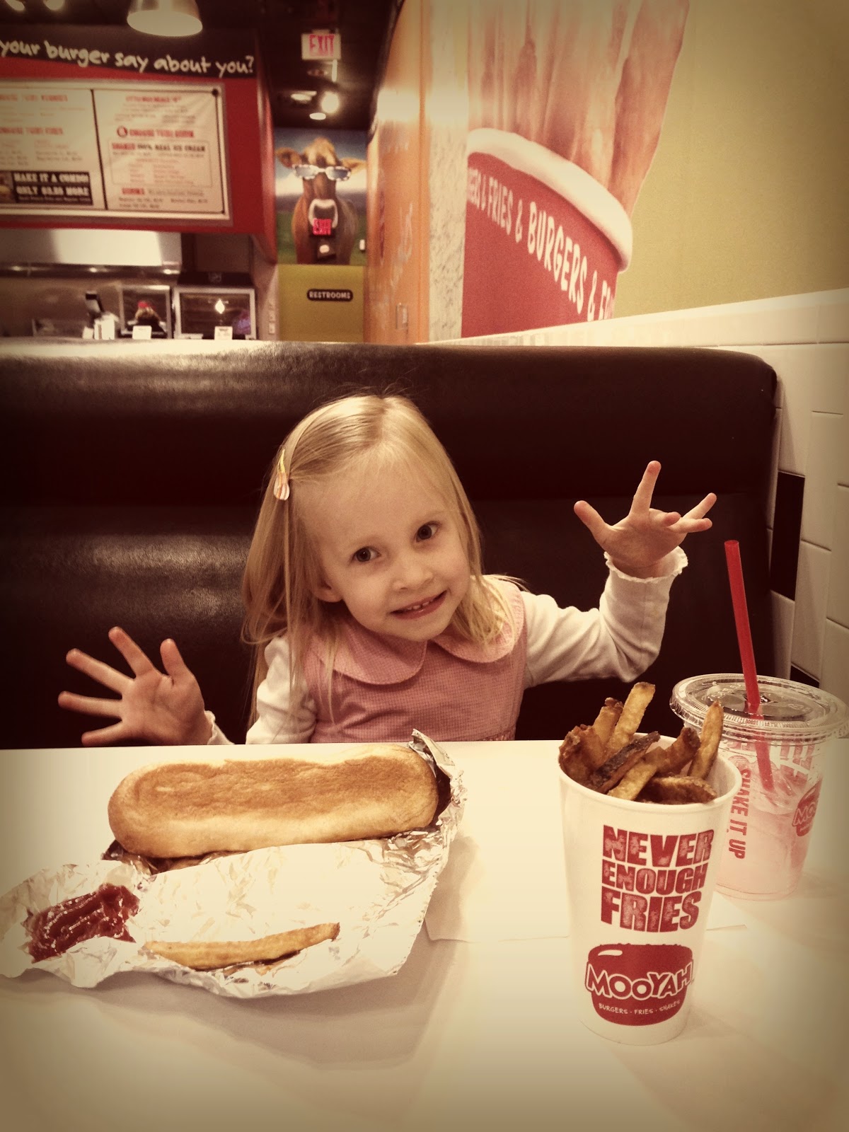 RRL took Lou. He emphasized that her Daddy was the first one to take her on dates, that her dates should always open the door for her and that the reason he was taking her on dates was to practice how she should be treated. She was just thrilled to dress in her pink dress, have her Daddy all to herself, and go to a fancy dinner at one of her favorite places…Moo-yah (see her best “MOOOOO-Yah expression below), followed by dessert at TCBY. Ha, nothing like a fancy dinner of hotdogs and icecream with your Daddy.