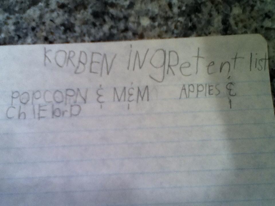 It was thanks to KJ that we had one of our very best family nights during February. Don’t get me wrong, its not like it was anything wildly creative, it was a family movie night. But somehow, because biggest brother was planning the Friday night shin-dig all week, the excitement level at our house was through the roof. Cbug’s teacher even sent a note home ‘Hope you all enjoy family movie night tonight, Cbug has been telling us about it all week.” To KJ’s credit, it was a well thought out event. He chose a movie everyone would enjoy (Robin Hood- Disney version, of course) and made two lists. The first list was the evenings “activities” which included “1)Eat and 2) Watch a movie in our PJs” and also a list of items that he needed us to buy before the evening. Here’s a photo of his “Ingredients”.The last item totally stumped me. Turns out, he wanted dinner to be from one of his favorite restaurants “Celebrity” (with a silent H of course).