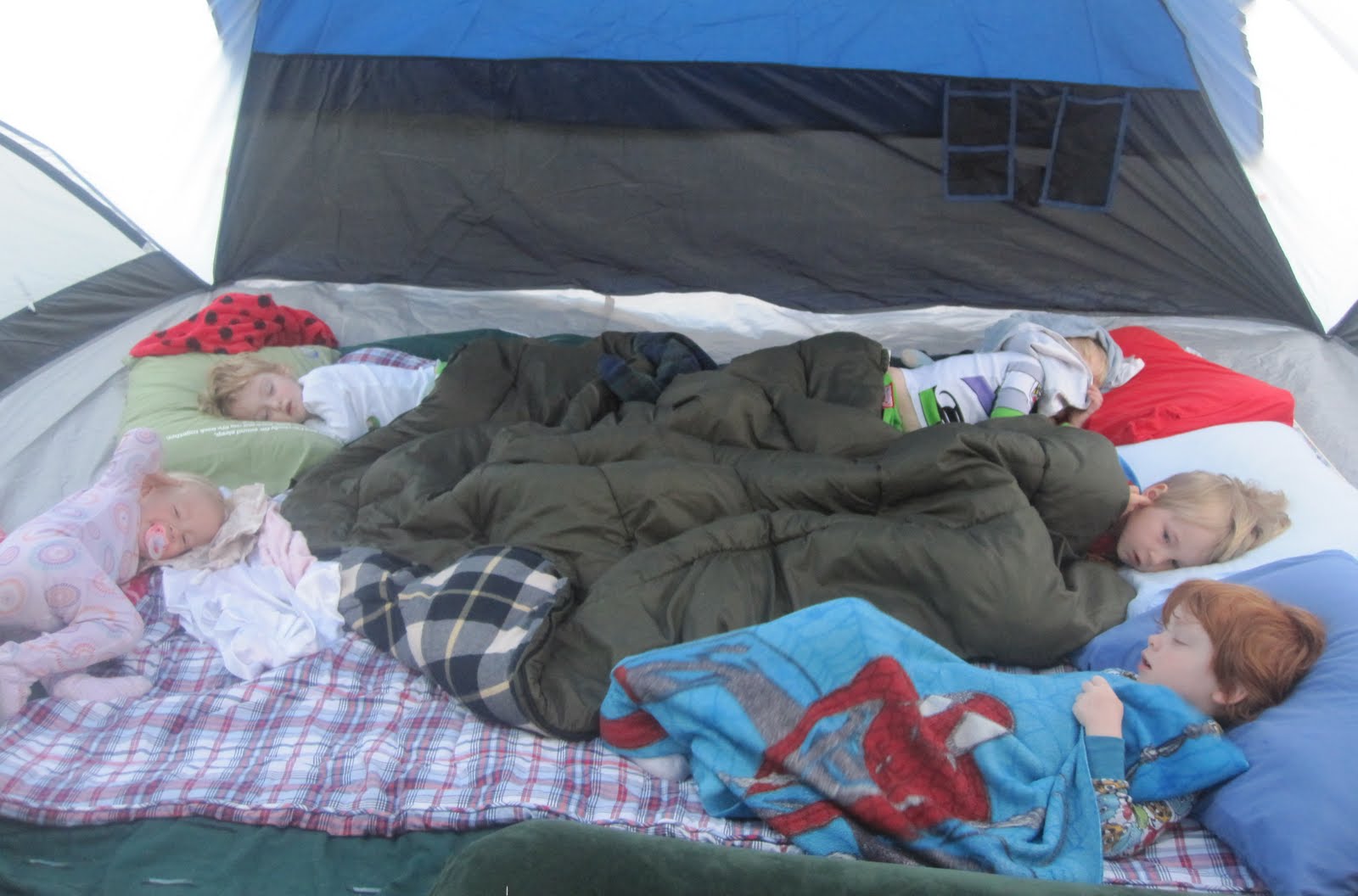 (this particular night 5 were all sleeping on one pallet in our tent when we went camping.  Baby B, not pictured, was in his packnplay.)