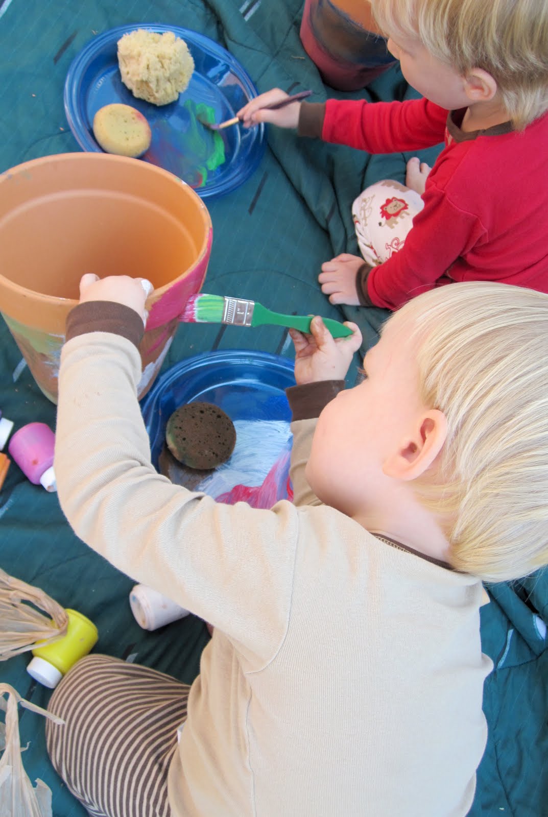 First, I let the boys paint the pots. We have found, over the course of our Monday projects, that we really do our best work in our pajamas!