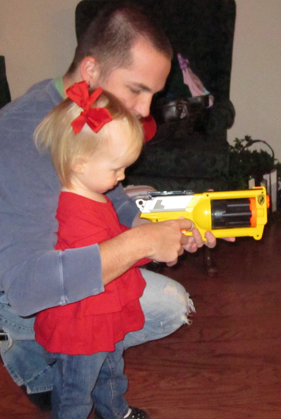 Oh, and don’t forget, Lou got her first “shooting” lesson.  I mean, it was just what she needed to round out her day of rocking babies, cooking in her kitchen, and having tea parties, right?  At least she is wearing a bow while doing it.  Goodness.